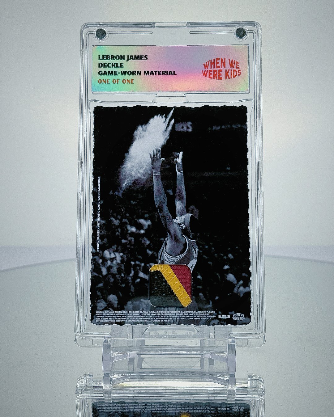 The relic in this piece has been carefully integrated into a custom, artist-designed card, created to honor both the moment and the material. This is not a manufactured patch or commemorative fabric. It is a true piece of NBA history, worn in-game by LeBron James.